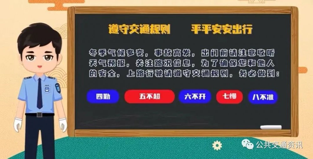 冬季氣候多變,事故高發(fā),出門前請(qǐng)注意收聽(tīng)天氣預(yù)報(bào),關(guān)注路況信息,為了確保您和他人的安全, 上路行駛請(qǐng)遵守交通規(guī)則,務(wù)必做到:四勤、五不超、六不開、七慢、八不準(zhǔn) 。