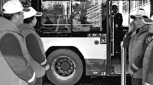 公交人下班后輪流在站臺(tái)當(dāng)起志愿者。晨報(bào)記者 王巍/攝