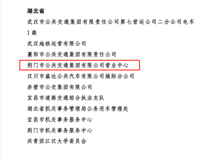 近日,交通運輸部、公安部、國家機關(guān)事務(wù)管理局、中華全國總工會、共青團中央聯(lián)合發(fā)出《關(guān)于表揚2023年綠色出行宣傳月和公交出行宣傳周活動成績突出集體和個人的通報》。其中,荊門市公共交通集團有限公司營業(yè)中心被評為活動成績突出集體,荊門市公共交通集團有限公司羅莎被評為活動成績突出個人。