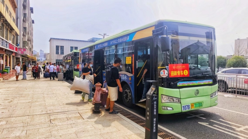 9月6日早上6點(diǎn)00分,市公交集團(tuán)將掛有“迎新專車”牌子的定制專車車隊,整齊地??吭诨疖囌颈睆V場進(jìn)行等待。