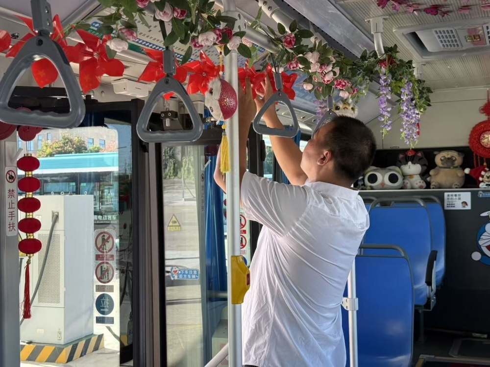 張峻峰是荊門公交2024年度“最美公交人”,他的車上總比別人多點(diǎn)“暖心”東西:駕駛座旁的小盒子里備著暈車藥、創(chuàng)可貼和折疊傘?!敖衲陣?guó)慶,就想乘客上車能樂(lè)呵樂(lè)呵?!庇谑菑埦寰蛣?dòng)了裝飾車廂的念頭。他自費(fèi)買了小國(guó)旗、風(fēng)車、燈籠等裝飾,晚上在家剪剪貼貼,白天利用休息時(shí)間在車上裝飾。張峻峰的行動(dòng),也是荊門公交服務(wù)提升的一個(gè)縮影。