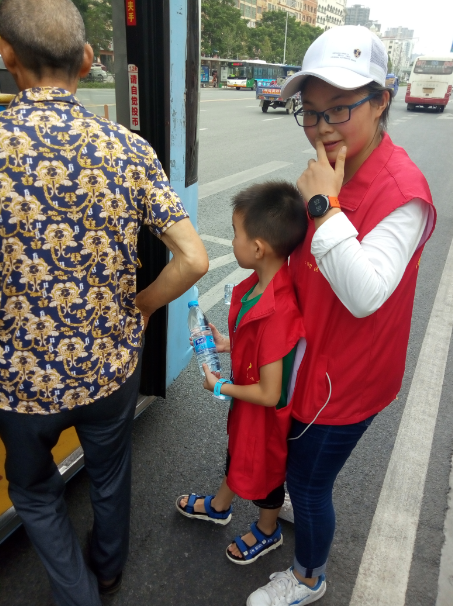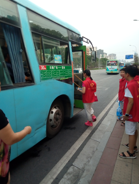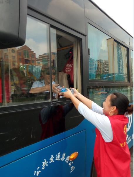 15時(shí)許,志愿者們已經(jīng)布置好了送水點(diǎn),將箱礦泉水?dāng)[在了站臺旁邊。每有一輛公交車進(jìn)站???,志愿者們都會給駕駛員們遞上兩瓶礦泉水,還有一些放暑假的小朋友們,也熱情的加入到此次活動,充當(dāng)著志愿主力軍,用他們的行動清涼了公交駕駛員的心,傳播著社會正能量。