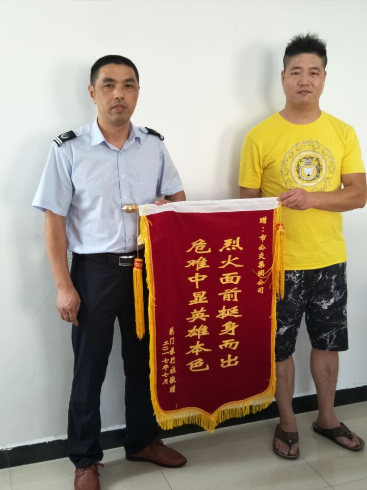 7月27日,荊門(mén)市旅行社出租汽車(chē)公司負(fù)責(zé)人及鄂H0A073的駕駛員專程來(lái)到荊門(mén)公交集團(tuán)公司,為果斷義舉滅火的公交陳旭師傅送上了一面“烈火面前挺身而出,危難中顯英雄本色”錦旗。