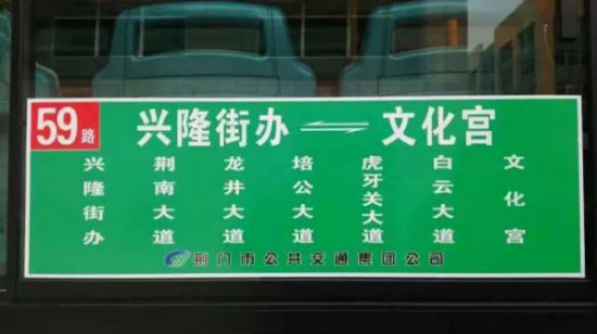 59路起于興隆街辦,止于荊門工人文化宮,全線共行駛興隆街辦、荊南大道、龍井大道、培公大道、虎牙關(guān)大道、白云大道、文化宮等主要線、點(diǎn),覆蓋高新區(qū)東片區(qū)的國(guó)昊文化、華工科技等主要企業(yè),連接九派通眾創(chuàng)園、區(qū)政府、十里牌、天鵝湖、中心客運(yùn)站等。早班為6:36分發(fā)班,晚上18點(diǎn)收班。計(jì)劃投入公交車20輛,首批投入6輛試運(yùn)行。至1月20日后正式運(yùn)行。