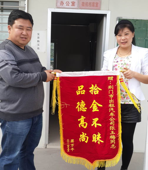 5月4日,乘客蔣女士從市出租汽車公司領(lǐng)回丟失的蘋果iphone5s手機(jī),感動(dòng)萬分,并送上印有“拾金不昧品德高尚”錦旗,以表達(dá)對的姐張玉梅的謝意。