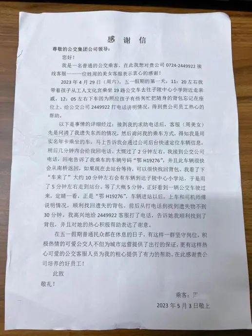 5月4日,小雨,一位熱心乘客走進(jìn)了荊門市公共交通集團(tuán)有限公司客服中心,送來(lái)一封溫暖的感謝信。信中,她向“五一”節(jié)假日期間堅(jiān)守崗位、積極熱心的公交人表達(dá)了濃濃謝意,紙短情長(zhǎng),字里行間流露出款款真情。
