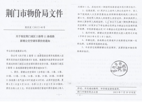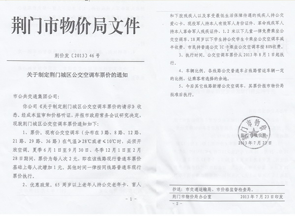 根據(jù)荊門市物價局《關(guān)于制定荊門城區(qū)公交空調(diào)車票價的通知》(荊價發(fā)[2013]46號)及《關(guān)于制定荊門城區(qū)2路等11條線路新增公交空調(diào)車票價的通知》(荊價發(fā)[2013]48號),公交空調(diào)車2014年6月1日至9月30日營運時段內(nèi)執(zhí)行2元/人次票價,現(xiàn)就執(zhí)行公交空調(diào)車票價后的有關(guān)事項公告如下: